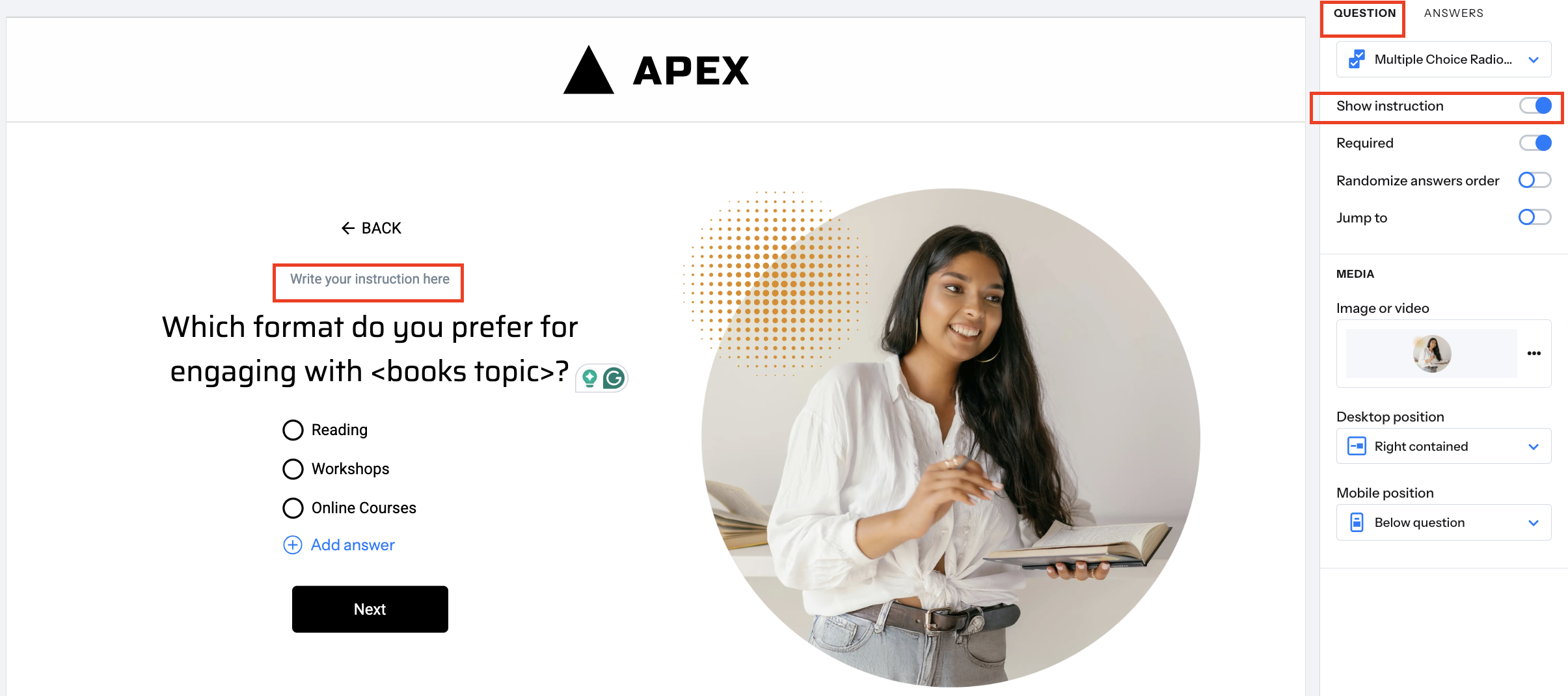 - Toggle on the "show instructions" option. This can be useful if you need to provide some guidance on how best to answer a question.