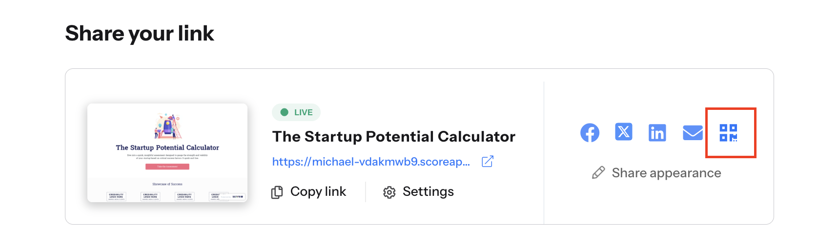 You can generate a QR code directly from your ScoreApp account. This allows your audience to scan and access your Scorecard instantly from their device.