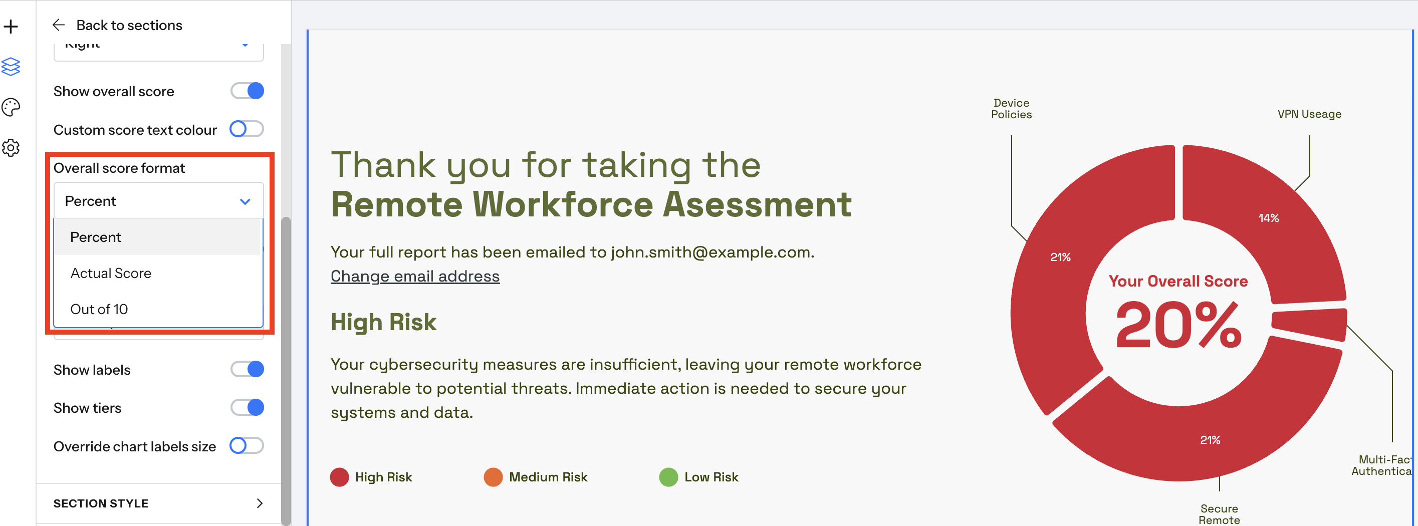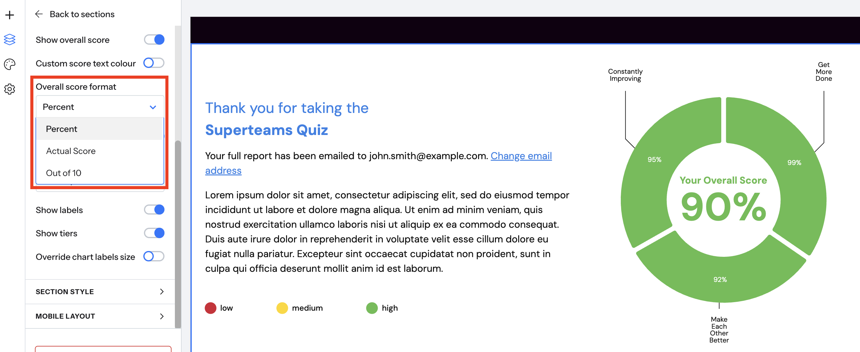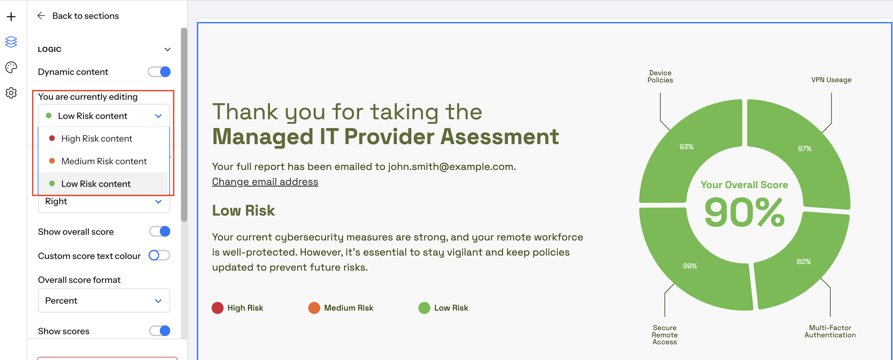 In the example below, the dropdown menu on the left shows the three tiers; Low, Medium, and High. Selecting each tier updates both the donut chart and the corresponding text, allowing you to preview how the content will change based on the user’s score.
