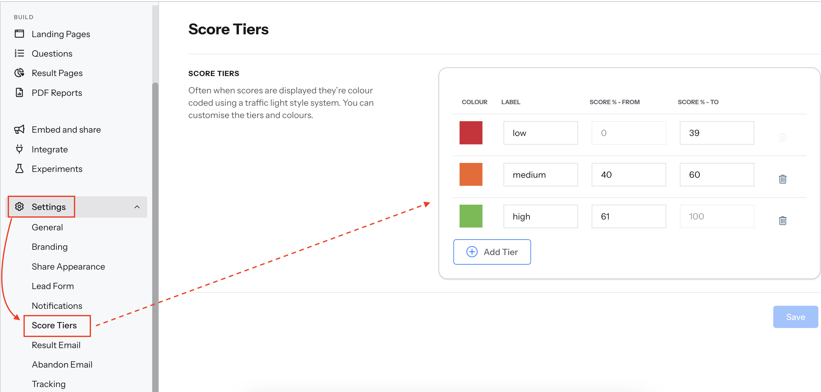 Score Tiers in ScoreApp allow you to group users based on their overall or per-category performance.
