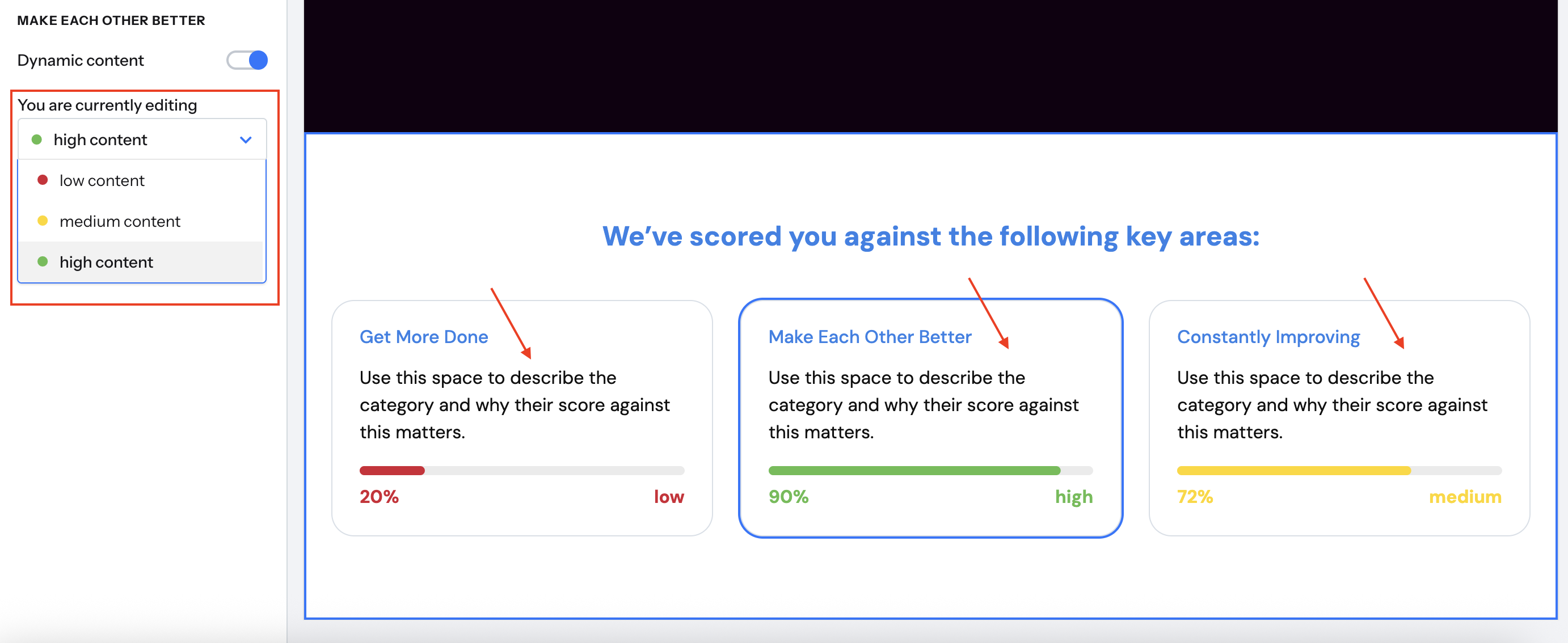 When you enable Dynamic Content, you can create unique versions of your results content for each score tier. This can include variations in text, videos, call-to-action buttons, and more.