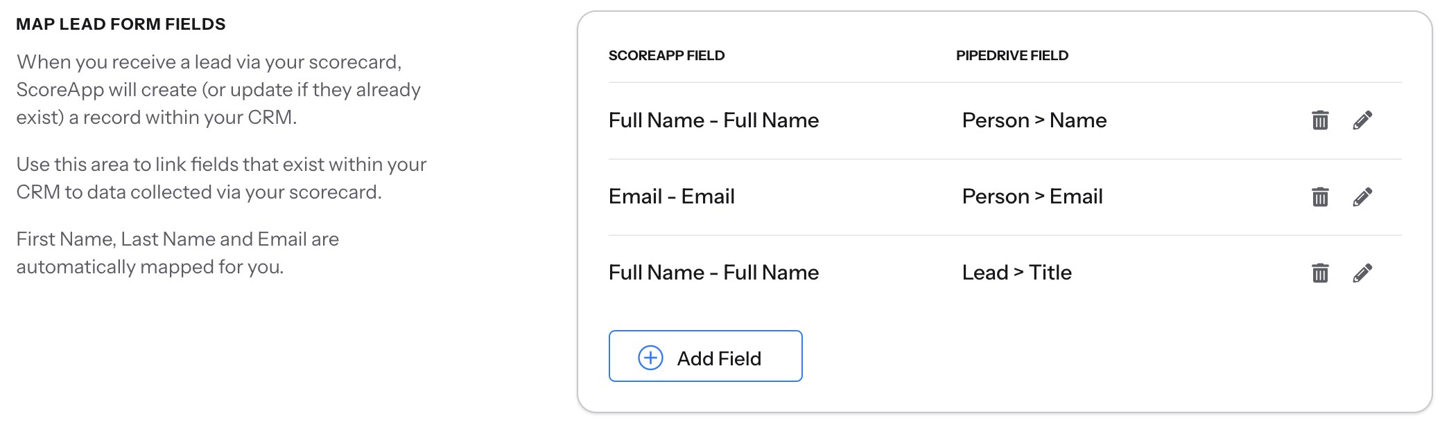 - By default, the basic fields from your ScoreApp lead form will automatically map to the default lead fields in Pipedrive.