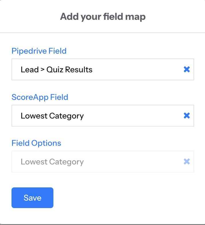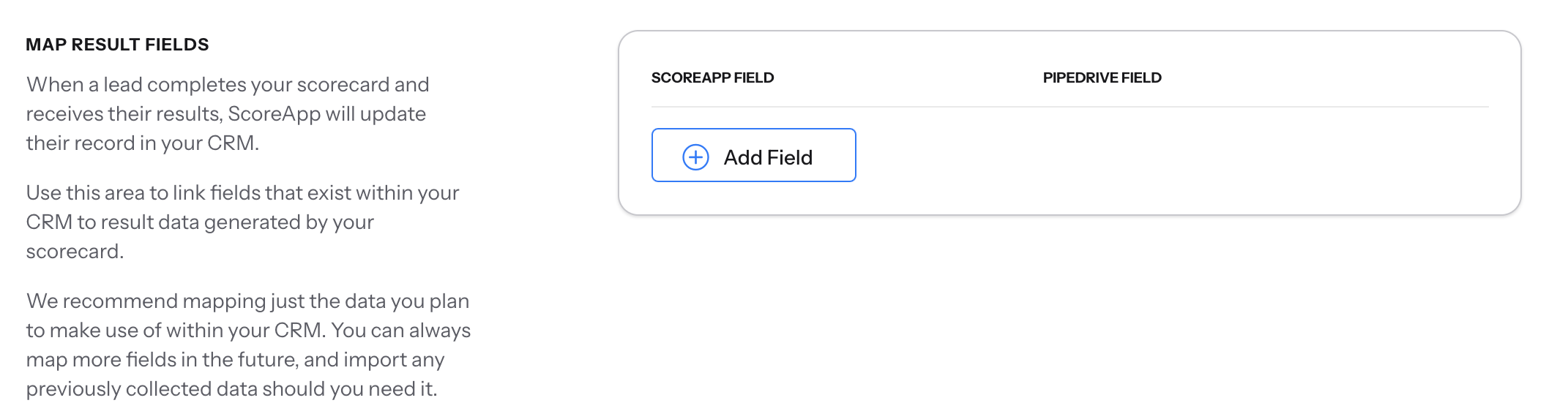 - In this example, we created a custom field in Pipedrive called Quiz Results. We then mapped the lowest category score from ScoreApp to that field. However, you can map any result information that is most relevant to your workflow.