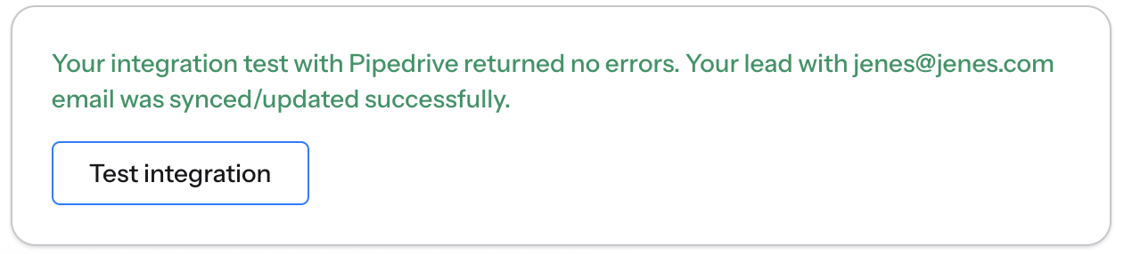 - Click the Test Integration button. This will take your last lead (or generate an example lead) and attempt to sync it into Pipedrive.