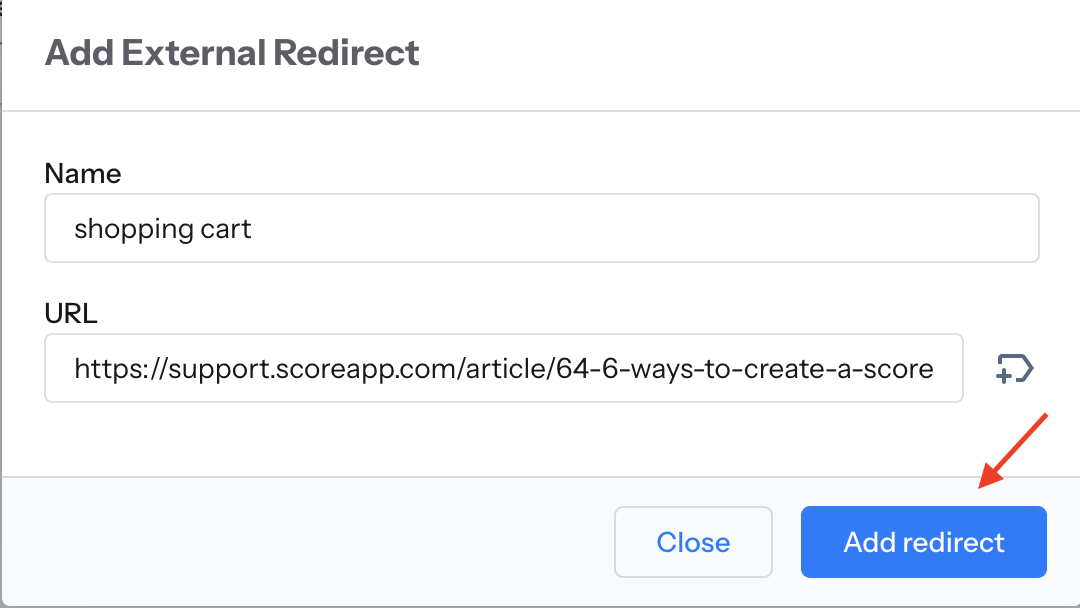 - Enter a Name (e.g., “shopping cart”) and the URL you want to redirect to (e.g., https://www.google.com).