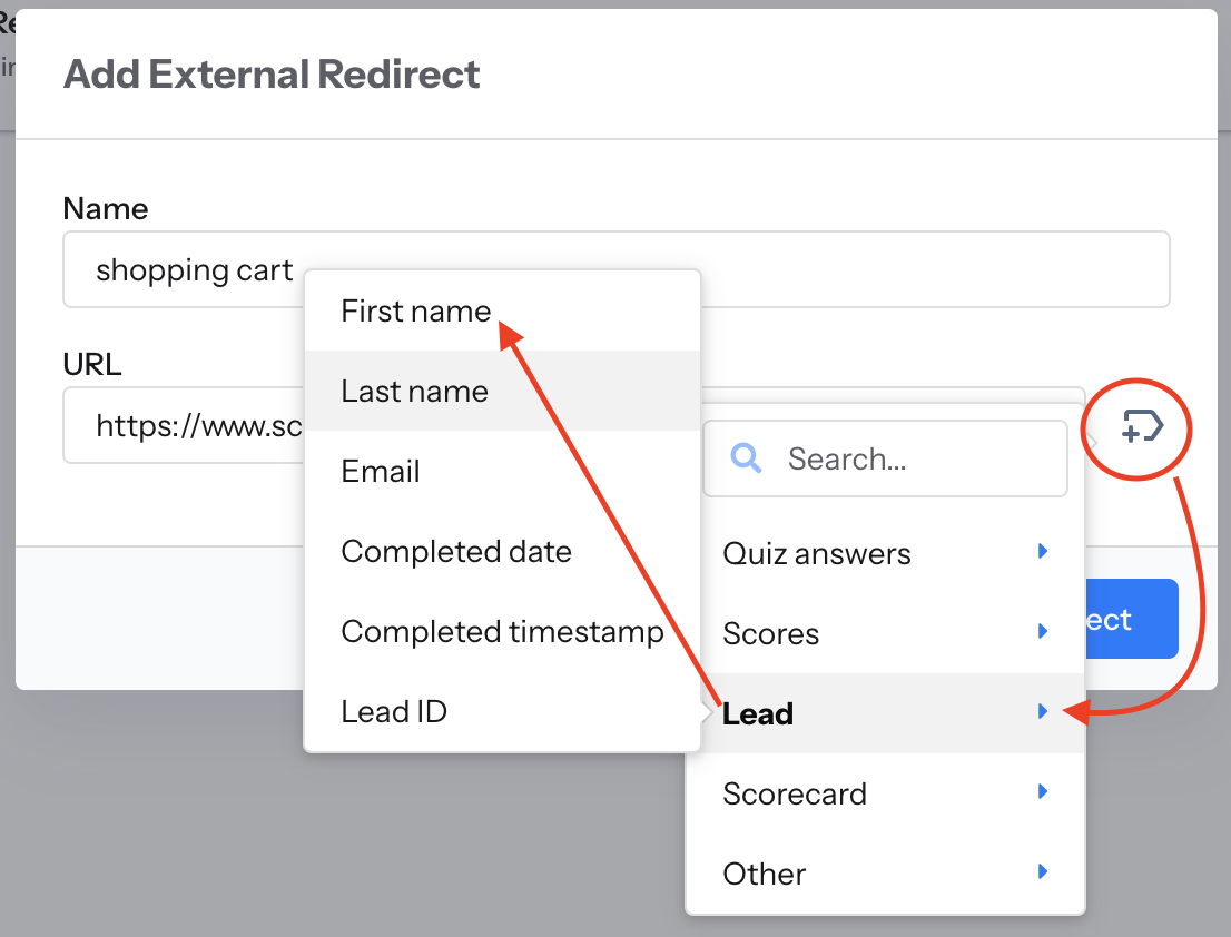 - Merge tags allow you to pass lead data (such as name, score, or category results) into your redirect URL.