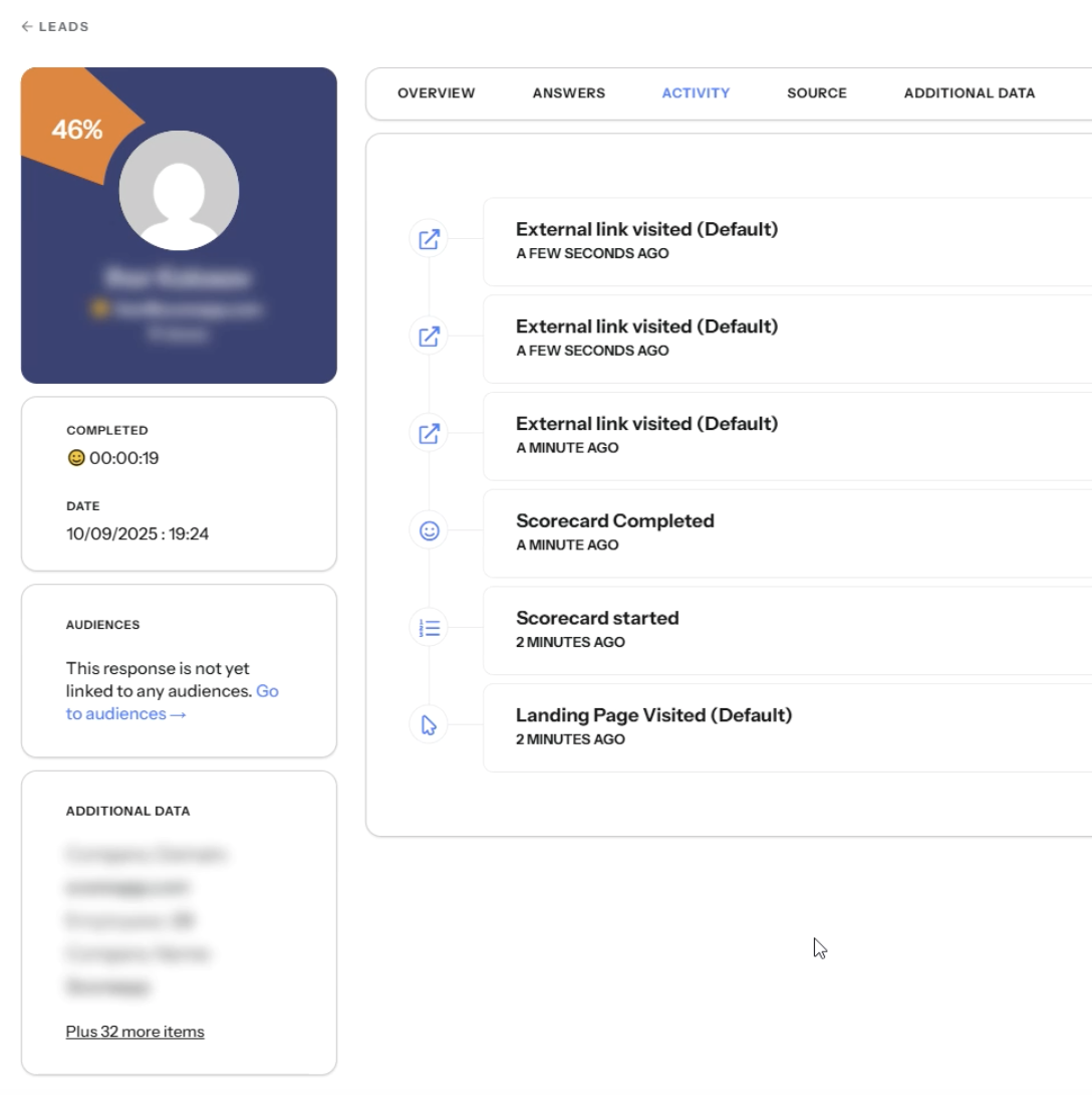 External redirects are fully tracked in "leads," located on the left-hand side of your scorecard. This makes it possible to measure engagement, even if the final destination is outside of ScoreApp.