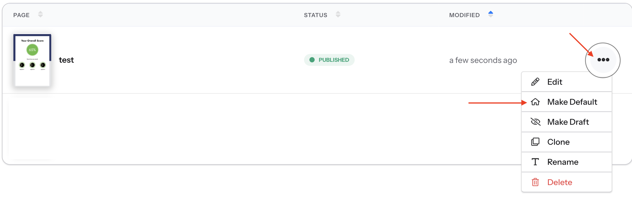 - If the status is Draft: Click the three dots on the far right-hand side, select Publish, then click the three dots again and select Make default.
