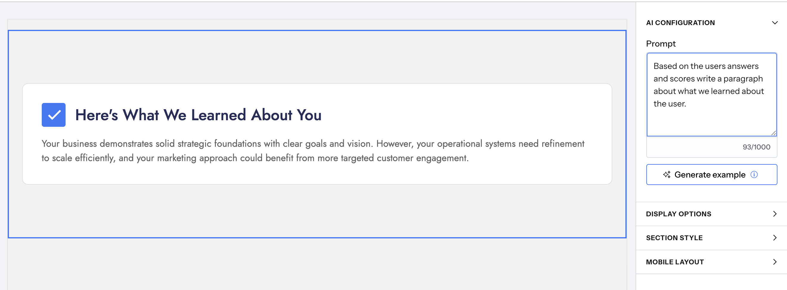 Smart sections allow you to use AI-generated content on your result pages. The AI-generated content is produced on the fly for each individual quiz taker and is generated by prompts that you control, combined with your quiz taker’s answers and scores.
