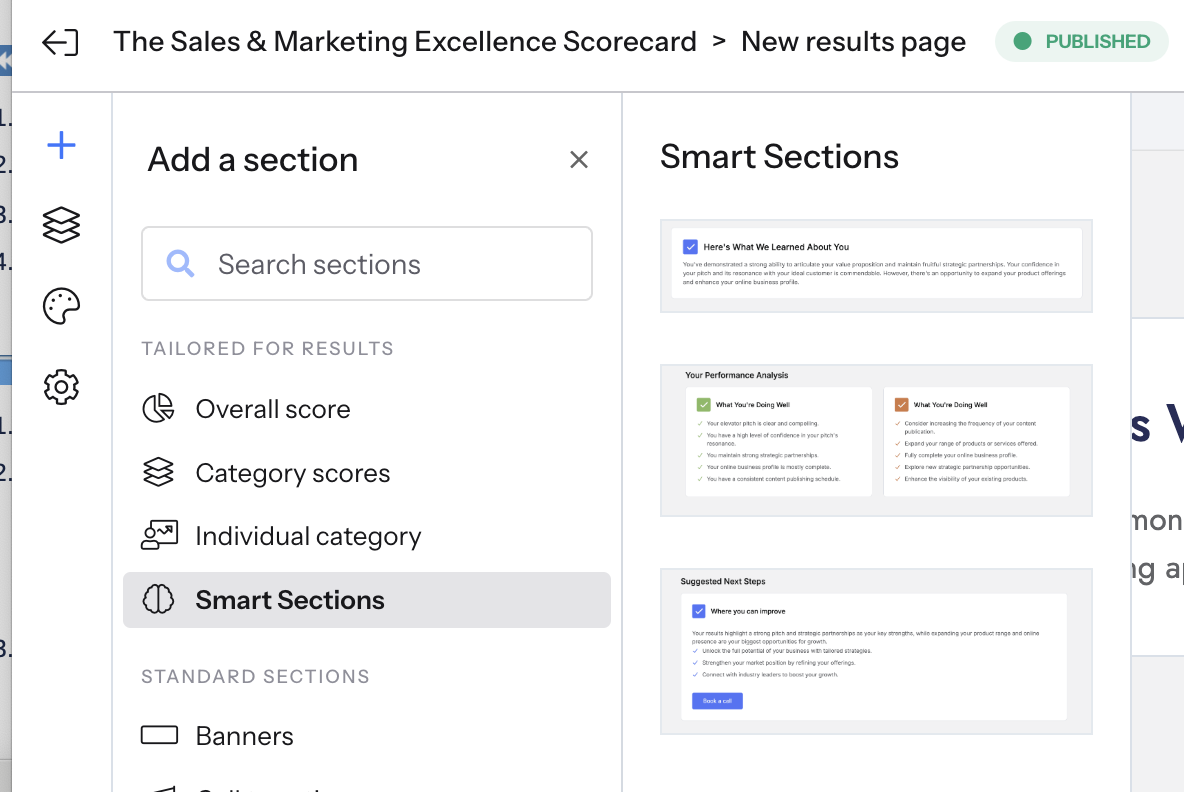 Start by creating a result page using one of our AI result page templates or by adding one or more smart sections to an existing result page.