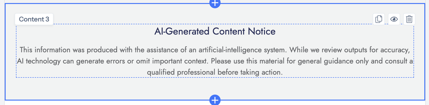 - Add a visible AI-generated content notice on any page that displays AI-created text.