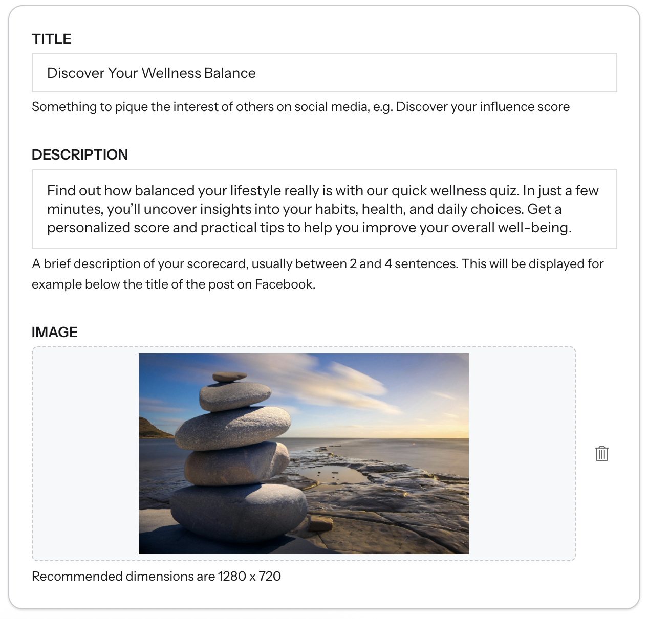 Image: This will be the main image that will appear when you share your scorecard link. Make sure this really stands out and is of high resolution.